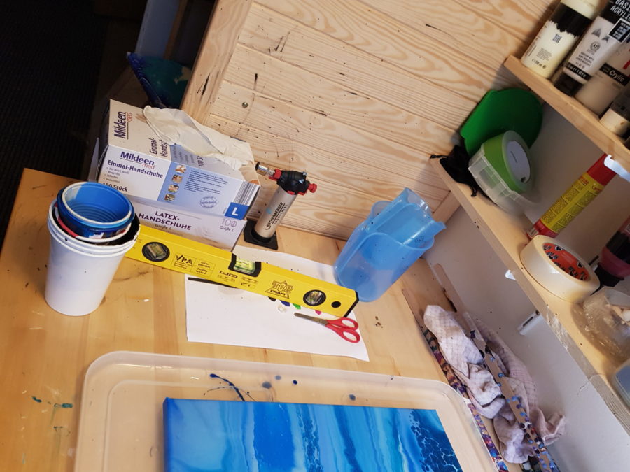 Den Luxus eines eigenen Bastelzimmers haben nicht viele und ich habe ein ganzes Jahr darauf zu gearbeitet mir meine Pouringecke einzurichten. Finde also einen Platz, der es verträgt einige Tage belegt zu sein und im schlimmsten Fall auch dreckig werden darf. Denke daran, dass Du dann auch noch einen Ort brauchst an dem Du Deine Werke lagern mußt.