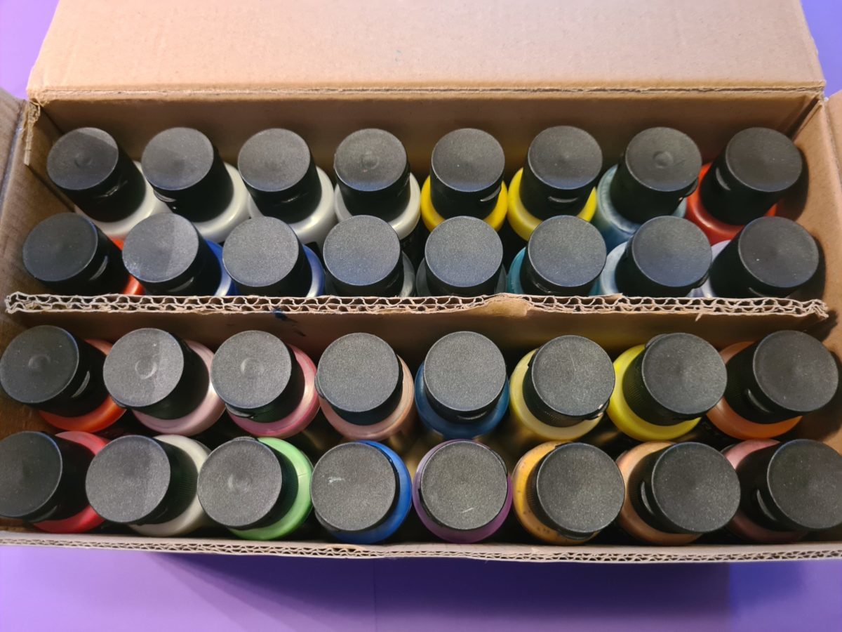 Die Auswahl der Farben geht von 9 normalen Farben, 9 Pastelltönen, 6 Neon Farben zu 4 Metallicfarben. Jede Flasche füllt 60 ml, wobei gängige Farben wie weiß und schwarz mehrfach vorhanden sind (weiß 4 x, schwarz 2 x). Hierbei ist fast jeder Farbwunsch erfüllt, wenn Bedarf besteht kann, so wirbt der Hersteller, ohne Problem eine bestehende Farbe mit schwarz oder weiß abgedunkelt oder aufgehellt werden.