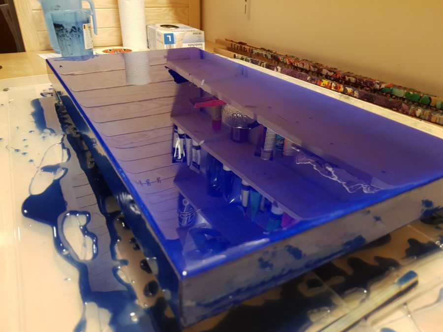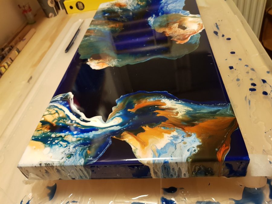 Mein Fehler hierbei war bei der ersten Resinschicht nicht ausreichend Pigment zum Resin hinzuzugeben, sonst wäre auch die erste Schicht bereits deckend genug gewesen. So hatte ich jedoch eine feste und nun ausreichend blaue Unterlage für den kommenden Pour.