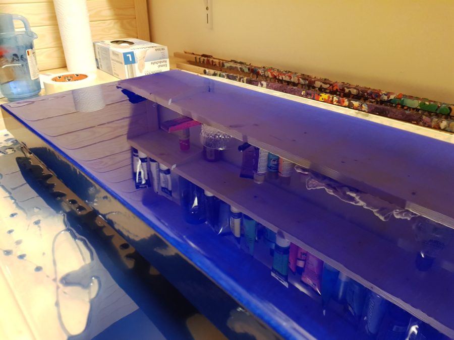 Bevor ihr mit dem Resin anfangt, achtet unbedingt darauf, dass euer Tisch oder Arbeitsfläsche in Waage ist. Des weiteren muß eure Arbeitsumgebung frei von Staub (so gut wie möglich) und Tierhaaren sein. Mein Artelier ist im Keller, unsere Haustiere sind nach entsprechenden Erfahrungen nicht in diesem Bereich erlaubt. Niemand möchte (wieder), dass die Katze durch ein trocknendes Bild latscht. Insgesamt habe ich pro Schicht mit Pigmenten ca. 450 ml Resin benutzt, so dass das Bild ausreichend bedeckt ist. (Den Link zum Resin Rechner findest Du hier.)