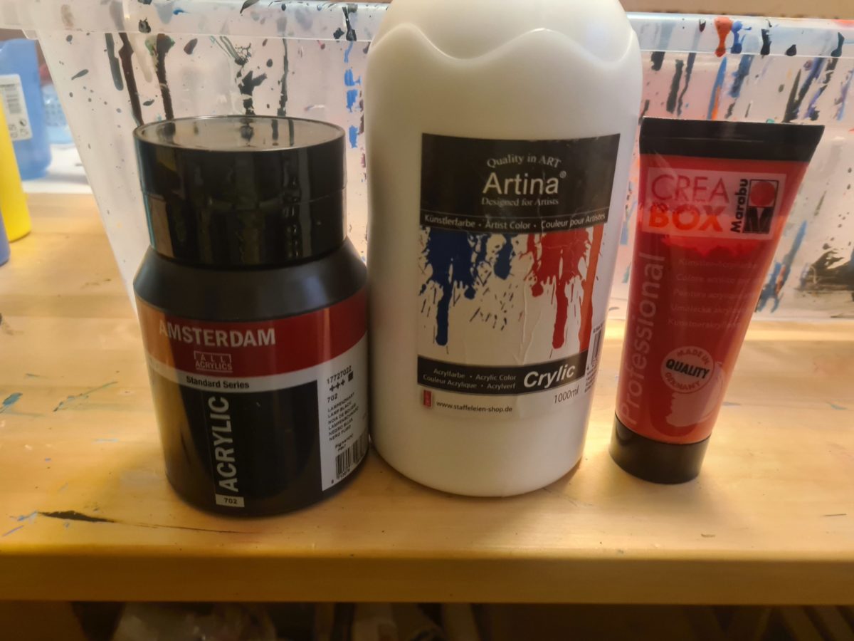 Bereite zwei verschiedene Becher für Deinen Pour vor. Schau, dass Du in beiden Bechern komplett gegensätzliche Farben nutzt. Vielleicht einen Becher mit kalten Farben wie Blau, dafür aber zusätzlich mit Weiß schichten. Den anderen Becher mit warmen Farben Rot, Gelb in Verbindung mit Schwarz. Beide Becher müssen nicht sauber geschichtet werden, denn Du willst keinen Ringpour machen. Die Vermischungen der Farben machen im Gegenteil die ganze Sache deutlich spannender.