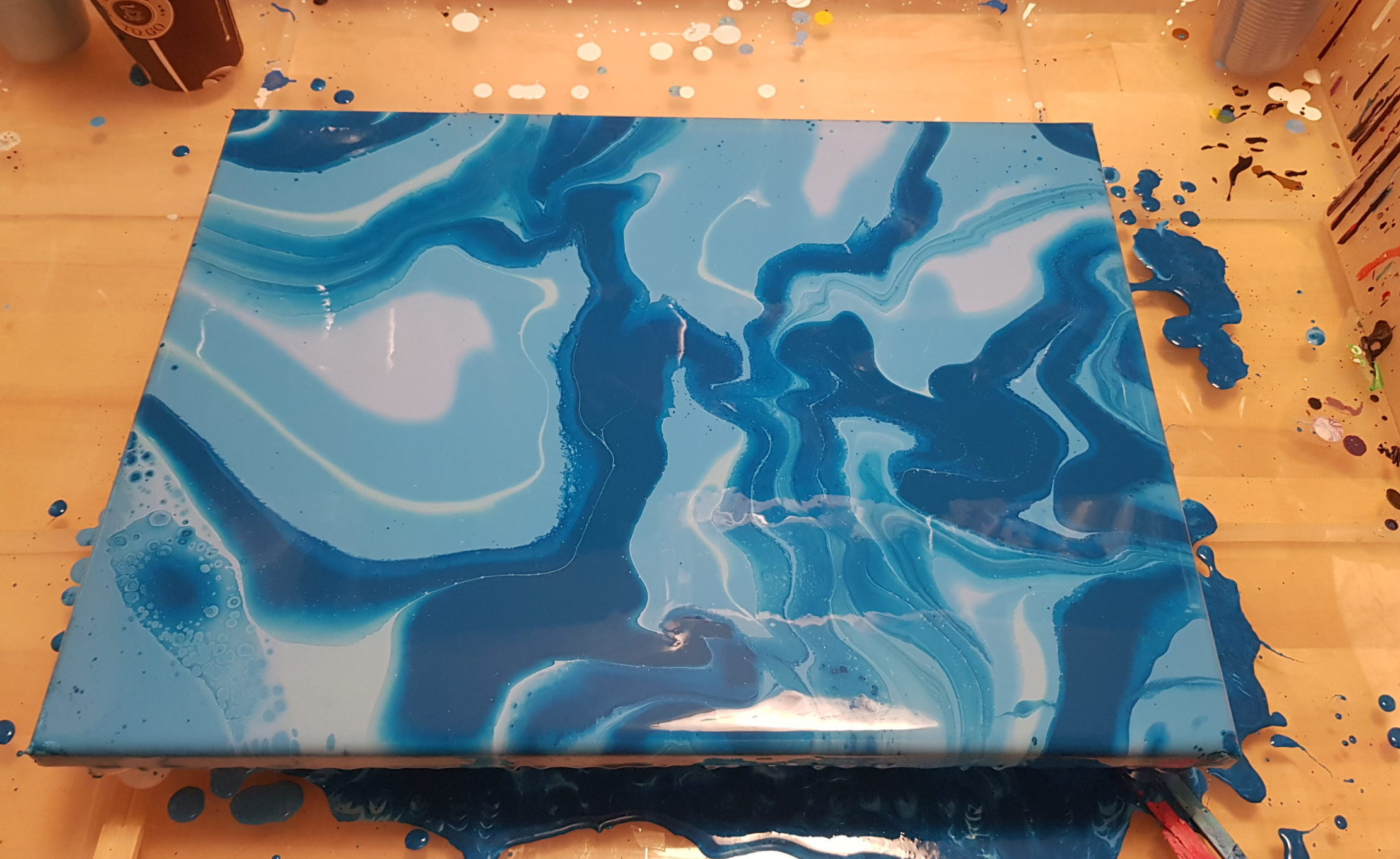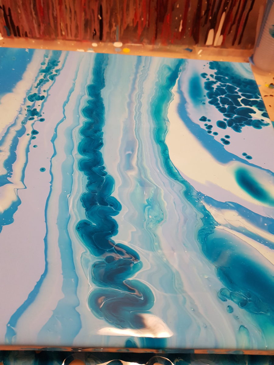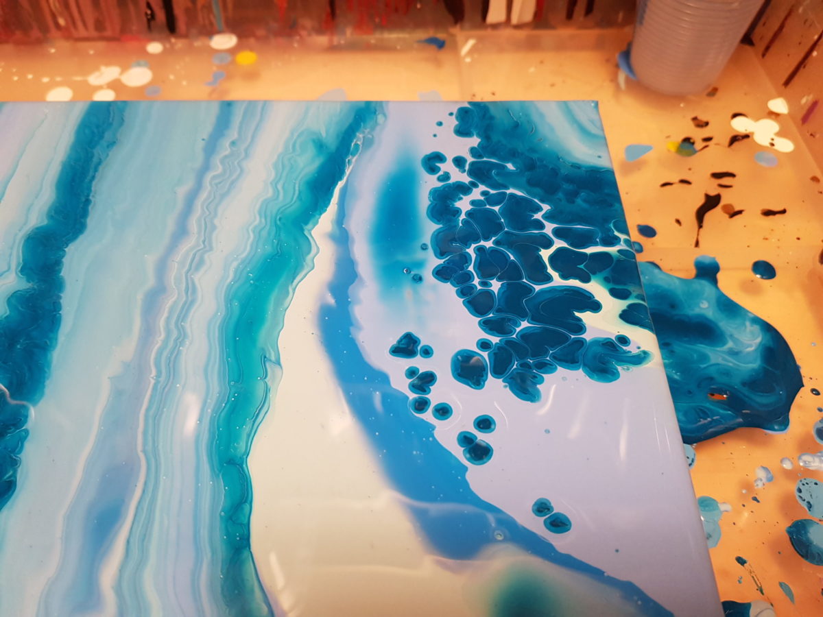 Vom Vorgehen des Anmischens und des Pourings an sich habe ich nichts geändert. Aber ich habe im Vorfeld sichergestellt, dass der Tisch in Waage war und ich nicht wieder Angst haben mußte, dass mein Bild „abrutscht“. Die Farbtöne waren angemischt, nicht zu flüssig und ich war echt nervös, als es daran ging die Puddles zu gießen.
