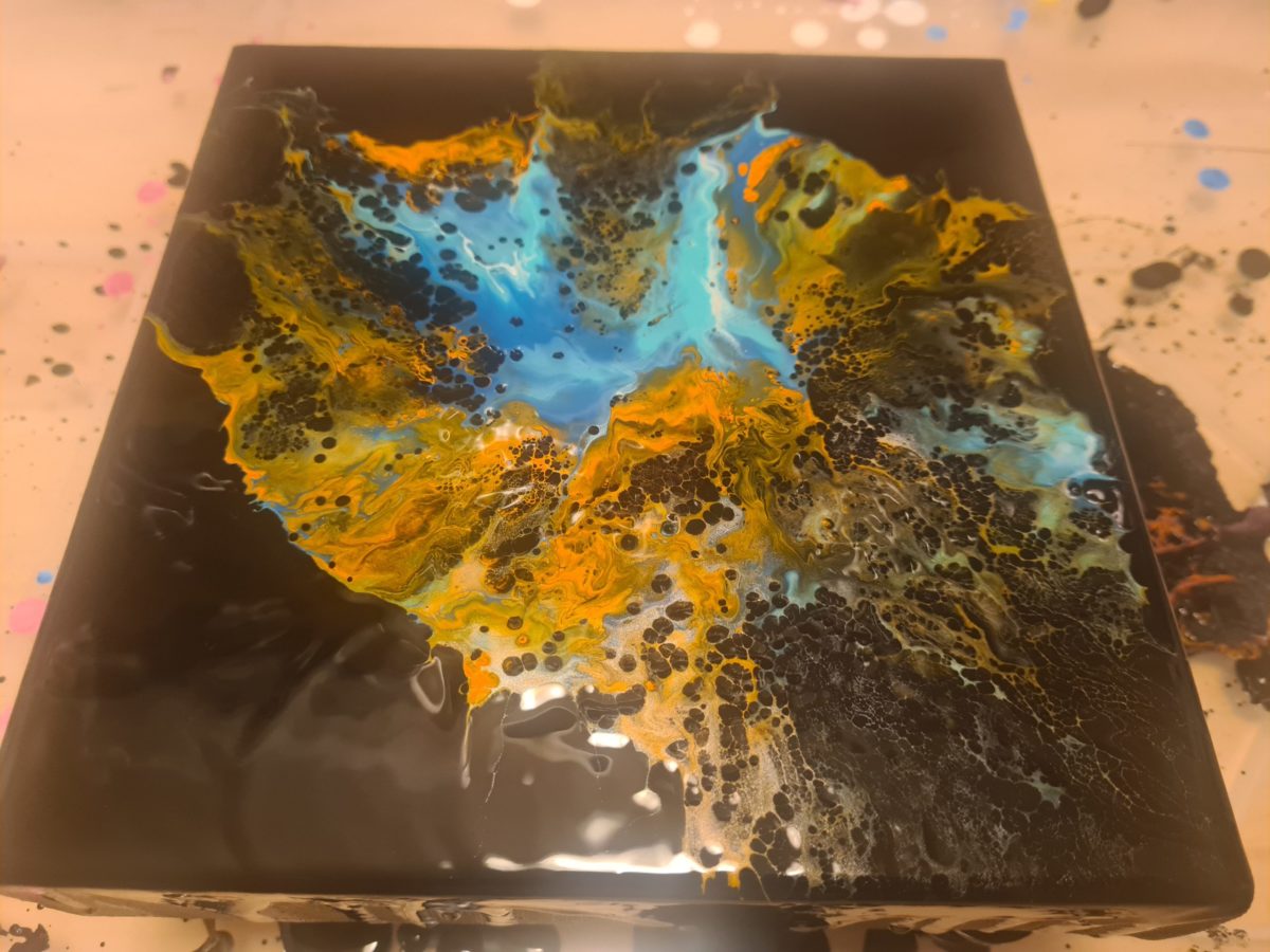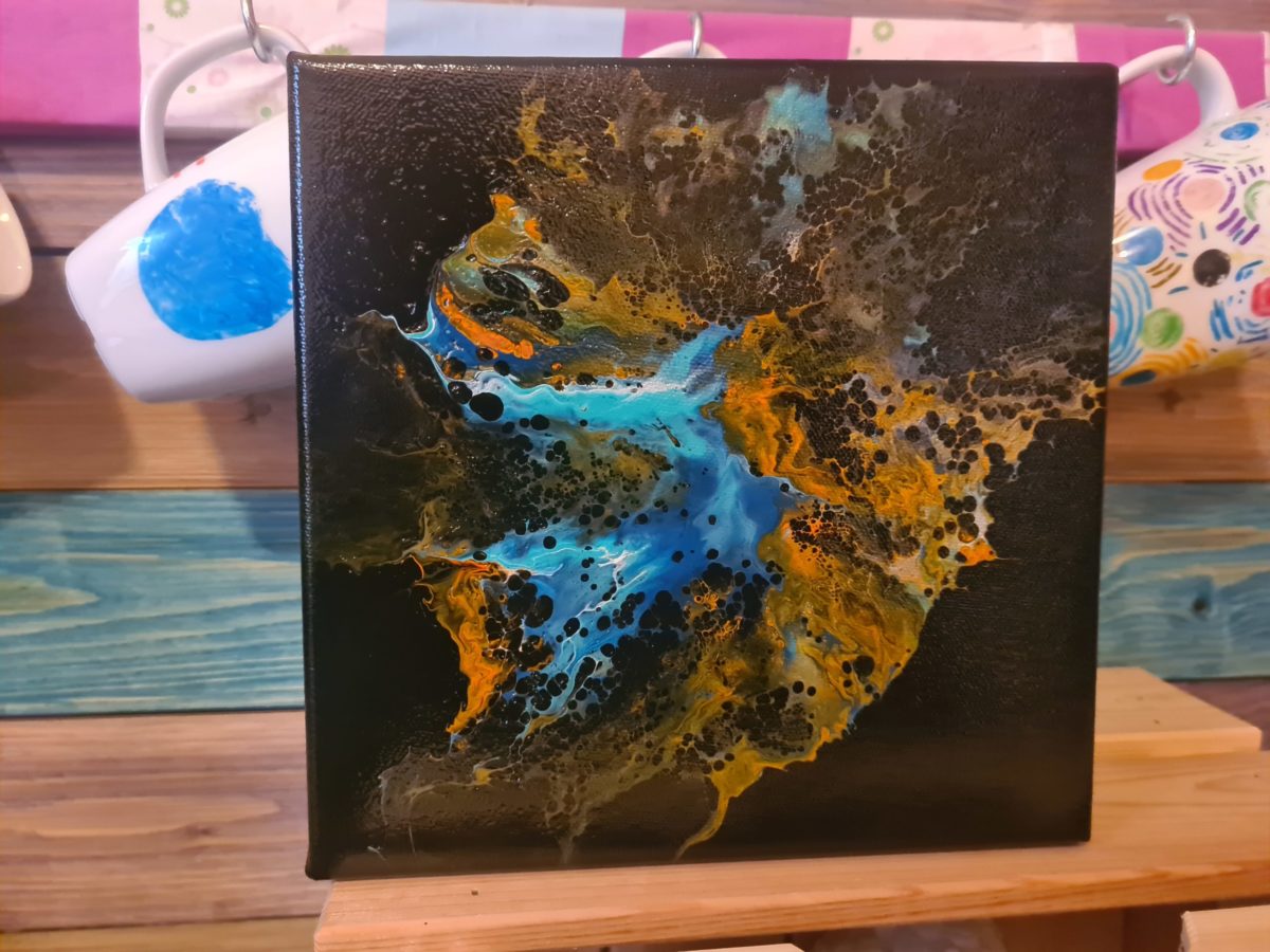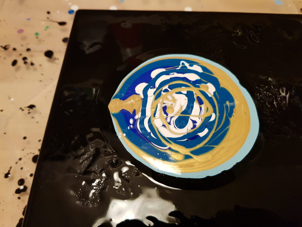 Da abkratzen der Farbe im trocknen Zustand nicht mehr möglich war, habe ich mich zum überpouren entschieden. Dieses Mal griff ich zu Orange, Ultramarinblau, Türkisblau hell, Weiß und ein Hauch von Silber. Und dieses Mal lief es deutlich besser.