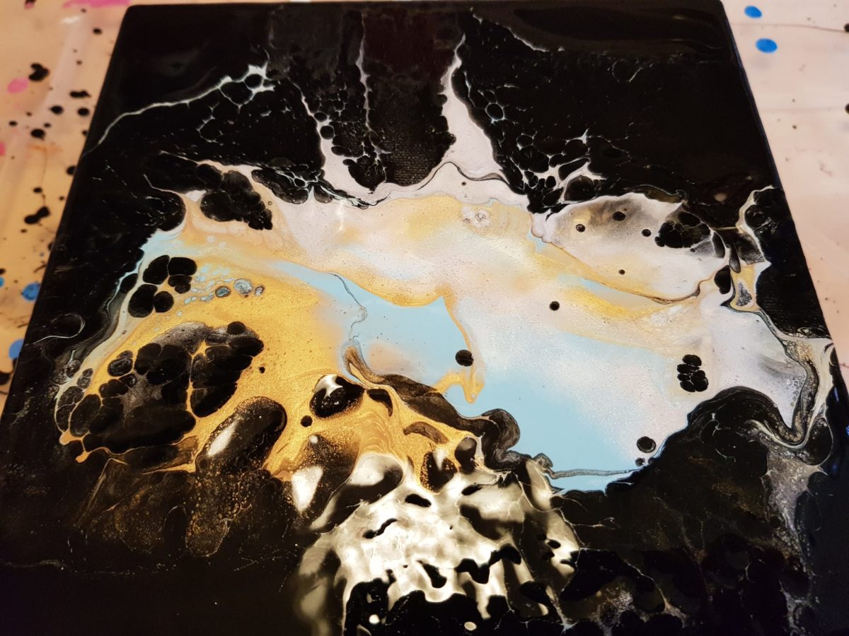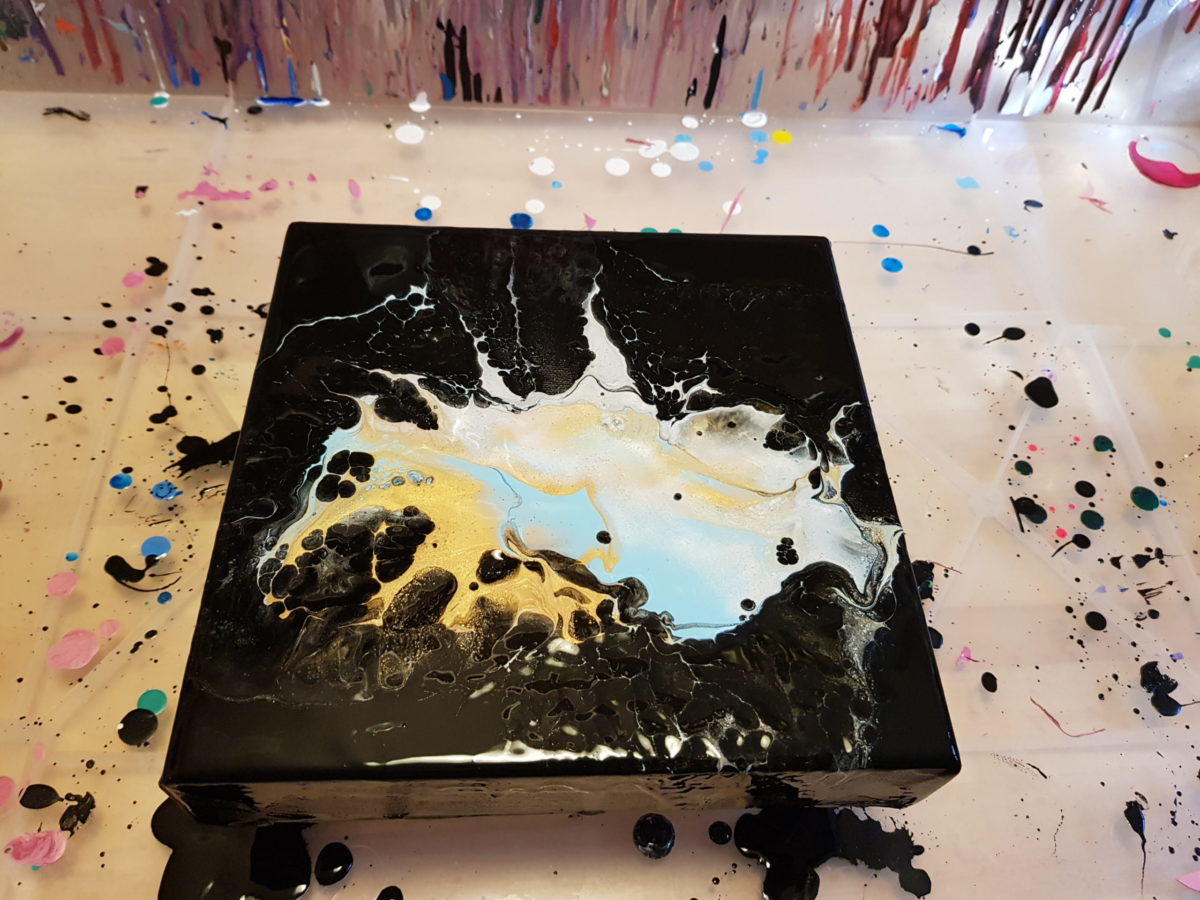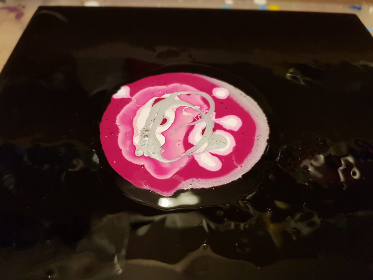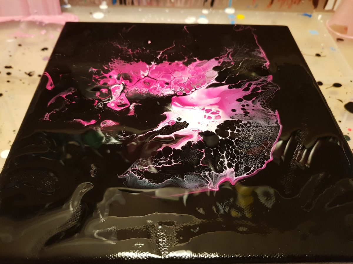 Der Weg hierhin war lang, aber keinesfalls von wirklichen Problemen gezeichnet. Ja, auch auf die Gefahr hin mich zu wiederholen Artina schwarz ist keine perfekte Grundierungsfarbe für einen Dutch Pour. Aber meine Quetschflasche ist nun auch alle und ich kann ggf. eine andere Farbe als Grundierung wählen. Ein schönes preussisch Blau wäre toll oder ein dunkles Violett kann ich mir für eine Miniserie ebenfallls gut vorstellen.