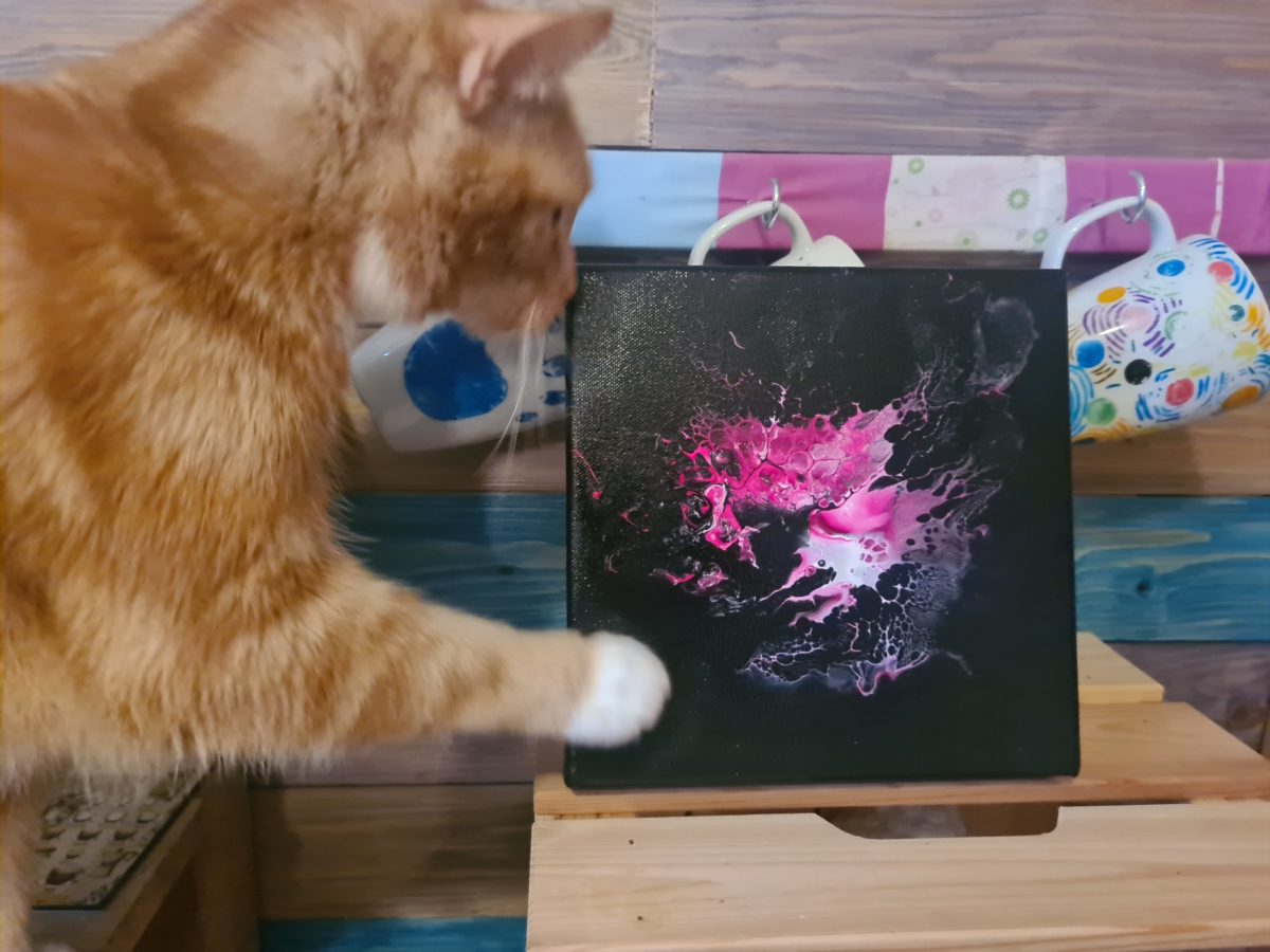 - Für alle Farben habe ich meine übliche Mischung Pouringmedium, Farbe und Wasser genutzt. Keine Hilfsmittel oder sonstigen chemischen Zusätze.