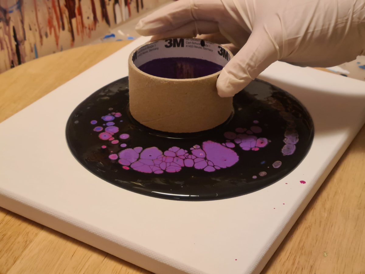 Lets Rock, lets be unique. Du beginnst damit, dass Du in die Mitte Deiner Leinwand ein Puddle mit der Grundfarbe setzt. Dieser sollte mindestens 1/4 der Größes Deines Bildes entsprechend. Hierfür eignet sich hervorragend Schwarz, denn die Kontraste der Farben poppen so ordentlich durch das Schwarz hindurch. Als nächsten Schritt setzt Du Deinen offenen Becher in die Mitte.