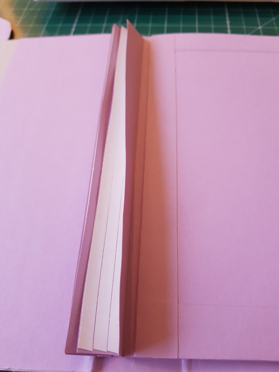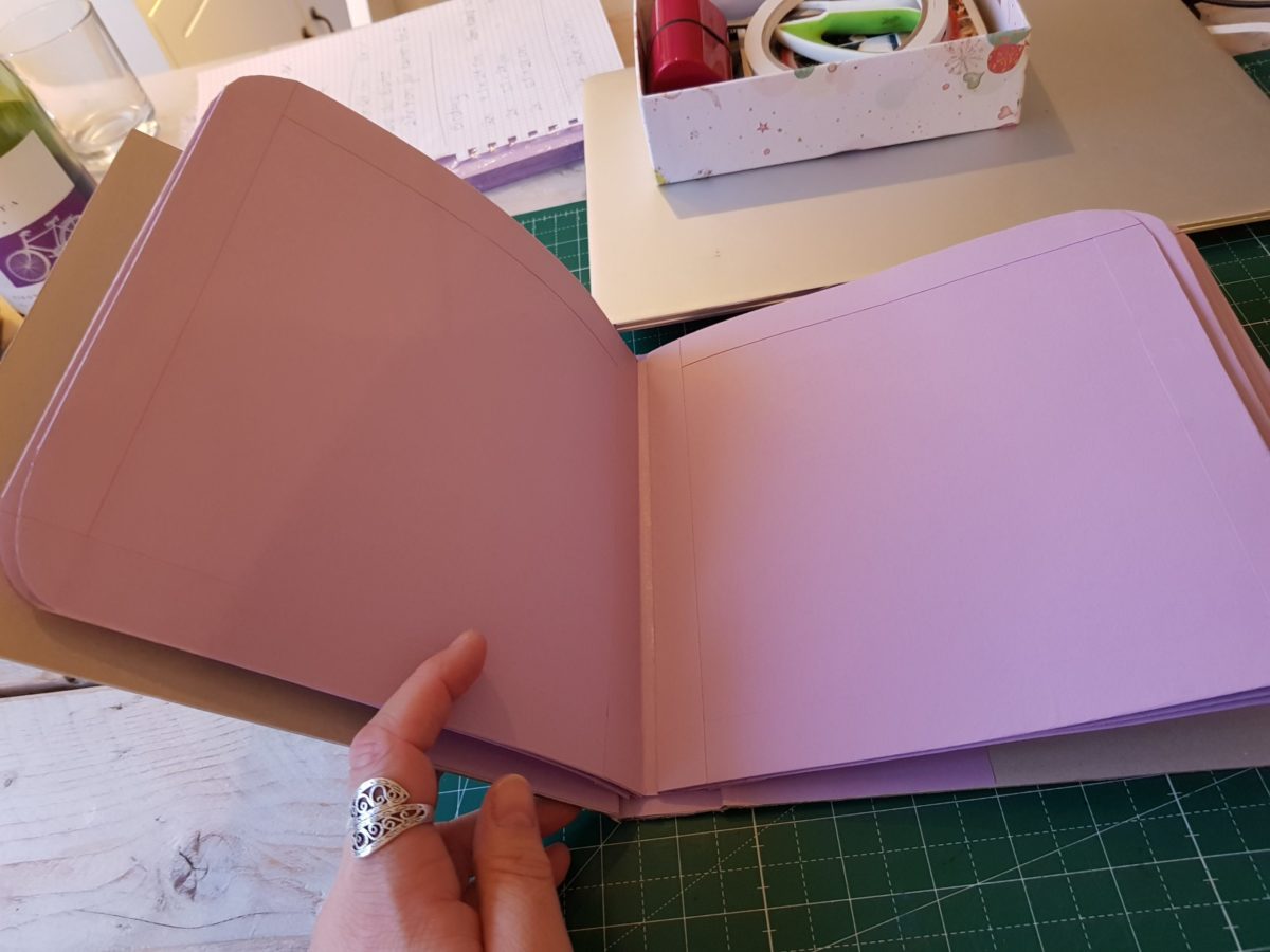 Genau so verfährst Du mit der linken Seitenlasche und wenn Du auch diese angedrückt hast, hast Du Deine Seiten in die Bindung eingebunden. Deine Seite ist nun zum Bebasteln fertig.