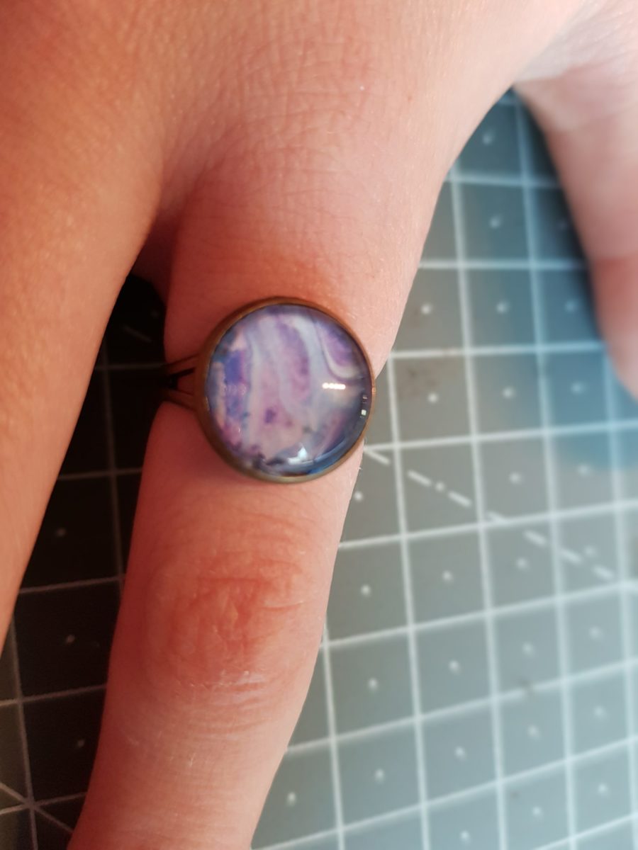 Fertig zugeschnittene Acrylhaut im Ring, der Cabochon muß nun mit dem Schmuckkleber befestigt werden!