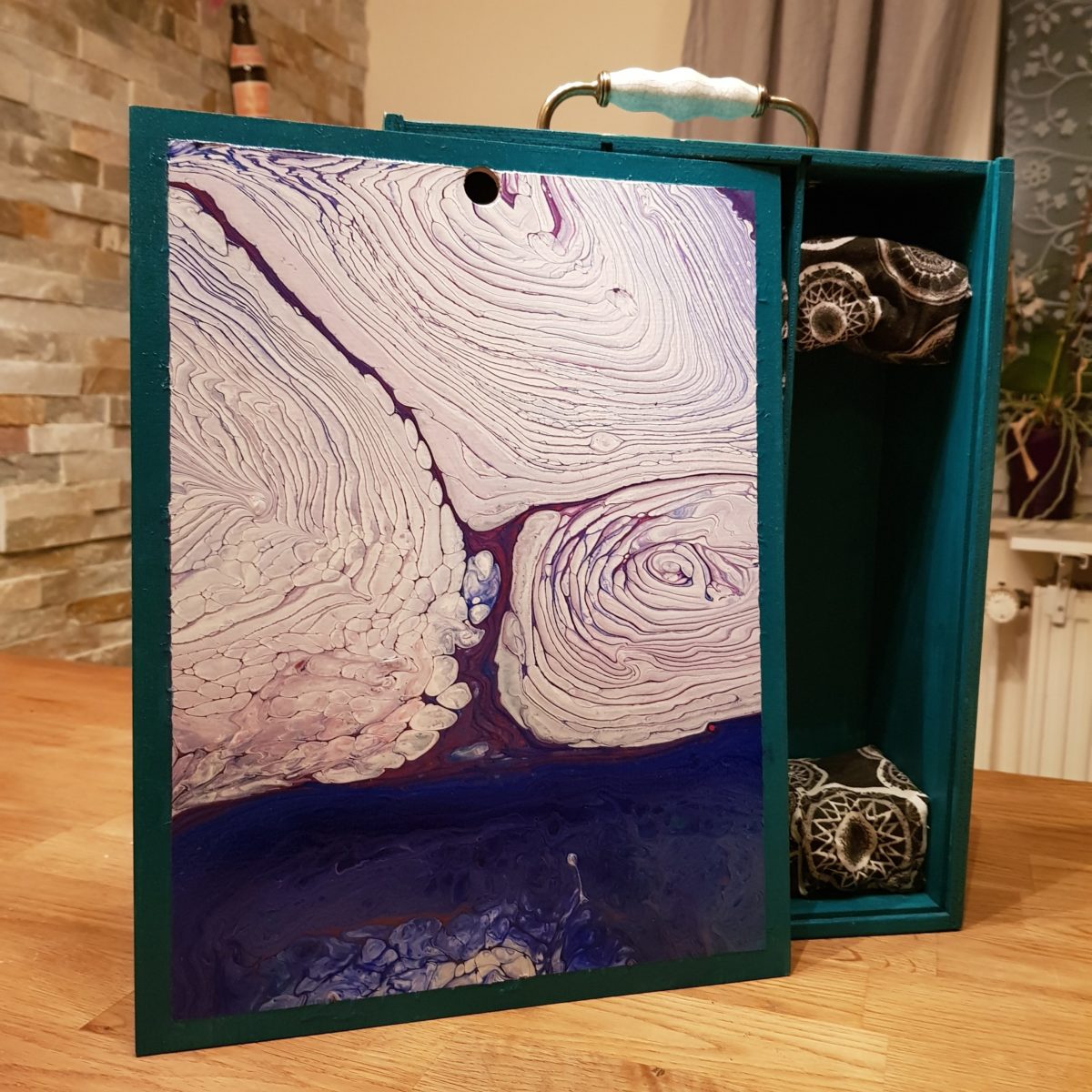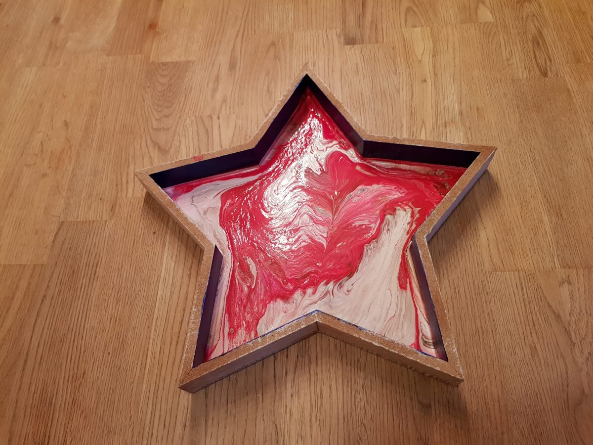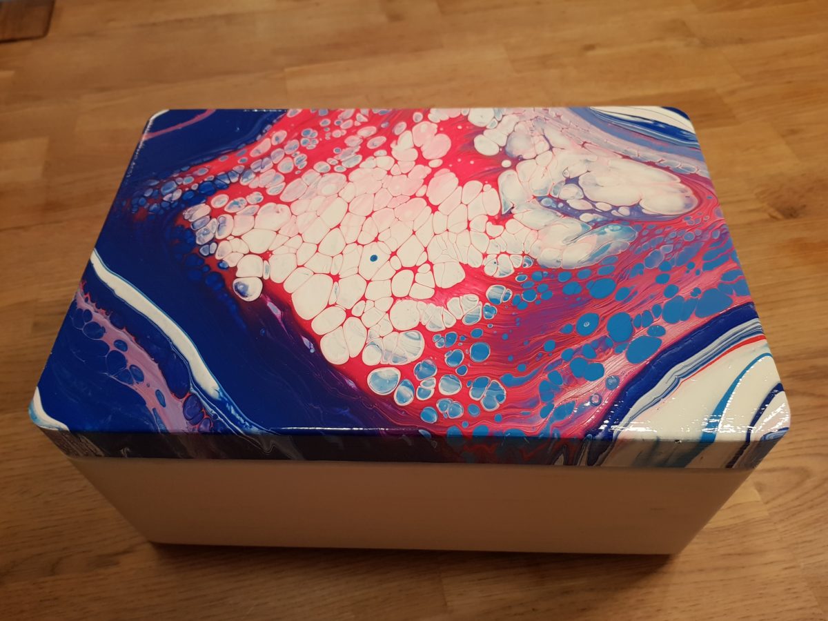 Der Phantasie sind hierbei keine Grenzen gesetzt: Tabletts, Kisten, Möbelstücke alles kann bepourt werden. Ich würde jedoch immer für den richtigen Fluß der Farbe darauf achten, dass im Vorfeld zum Pouren Farbe auf dem Holz ist, so dass die Farbe besser gleiten kann.