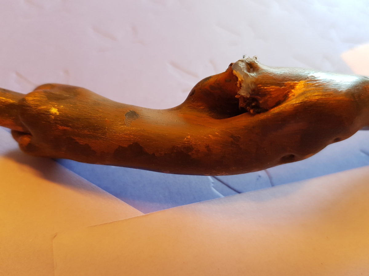 Dann kommen die Effekte, die dem Zauberstab mehr Tiefe geben sollen. Mit dem Ockerton, dem Rotgold und Kupfer habe ich mittels Taschentuch Tiefen in den Stab hineingearbeitet, so dass z.B. die Spiralen hervortreten. Ich habe kleine Farbtupfer aufgetupft. Auch die magischen Perlen am Ende des Stabes und die magische Spitze habe ich nun mit dem iridiesierendem Weiß hervorgearbeitet und dem Türkis, um die Magie des Stabes hervorzuheben. Nach dem Trocknen war das Schmuckstück fertig.