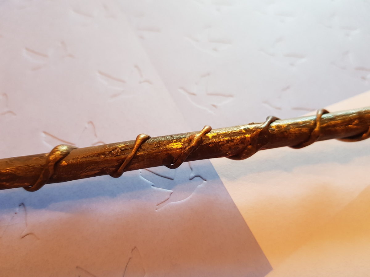 Als erstes habe ich den Griff mit Heißkleber ummantelt und am unteren Ende des Astest kleine Perlen aufgeklebt, um eine „schöne“, unebene Fläche zu bilden. Den Stab an sich habe ich in Spiralen mit dem Kleber versehen, um ihm eine Struktur zu geben. Am Ende, an de Spitze habe ich nun kreisförmig ebenfalls ein paar Perlen angebracht und dann von oben nach unten den Kleber laufen lassen, so dass er wie ein kleiner Tropfen aussieht.